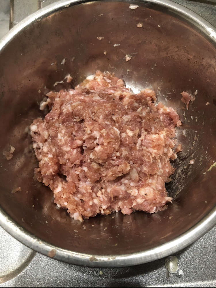 豚のひき肉に、調味料としてにんにく、しょうが、しょうゆ、砂糖、