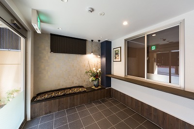 ↓そして入口エントランスには、長旅で疲れた方々に少し座っていただけるようにベンチカウンターを設置。