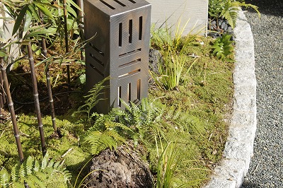 でも苔ってすぐに枯れてしまうので諦めようかと思いましたが、外構屋さんが枯れにくい種類を探してくれて、入れることが出来ました。行燈のような照明と浮き玉を浮かべた水鉢も、苔のおかげでグッと映えます。悩んで選んだものが格好よく出来上がるとホントに嬉しい♪ あぁ~悩んだ甲斐がありました(笑)