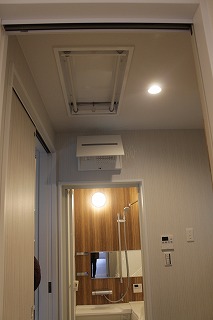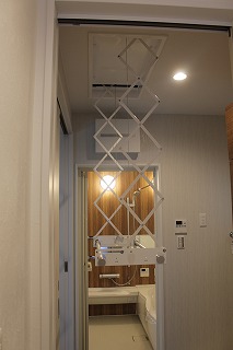 「浴室乾燥機で洗濯物を乾燥中でもお風呂に入れるよう、仮置き場が欲しい」とのことで天井部分に室内物干しの「ホシ姫」を設置。これは電動なのでボタン一つで竿部分が上下します。