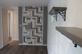 壁のアクセントクロスに合わせて、棚受けもアイアンの可愛いものをお選びさせていただきました。