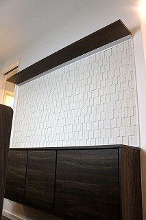 またキッチンには食器を収納できる棚と上部には飾り棚を取り付けて、その間には「エコカラット」というタイルを貼りました。キッチンの照明がまだ付いていなかったので写真は少し暗めなのですが、照明がつくとタイルの凹凸感がより一層分かると思います。