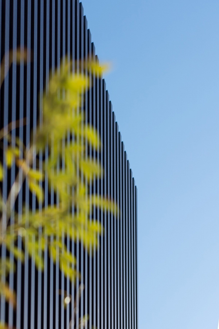 格子と植栽の緑が映える外観