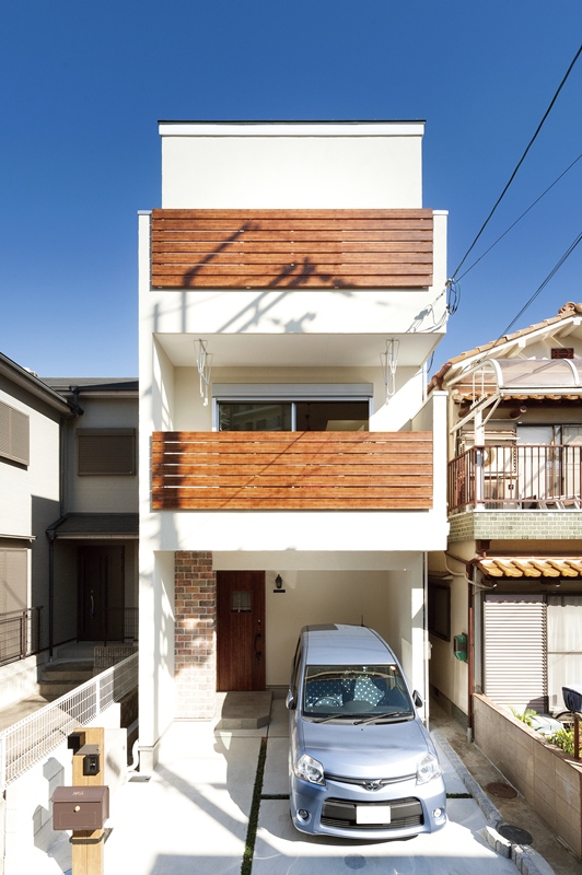 青い空、白い外壁、明るい茶色がアクセントのベランダ。