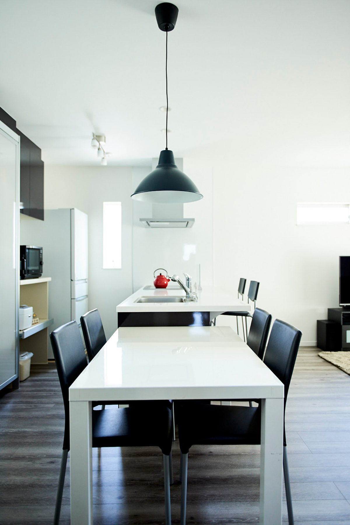 お客様がご希望された、キッチン横のダイニングやパントリー・SCLなどを取り入れ、南採光に気を使いながら窓を配置しとても明るい室内に。
