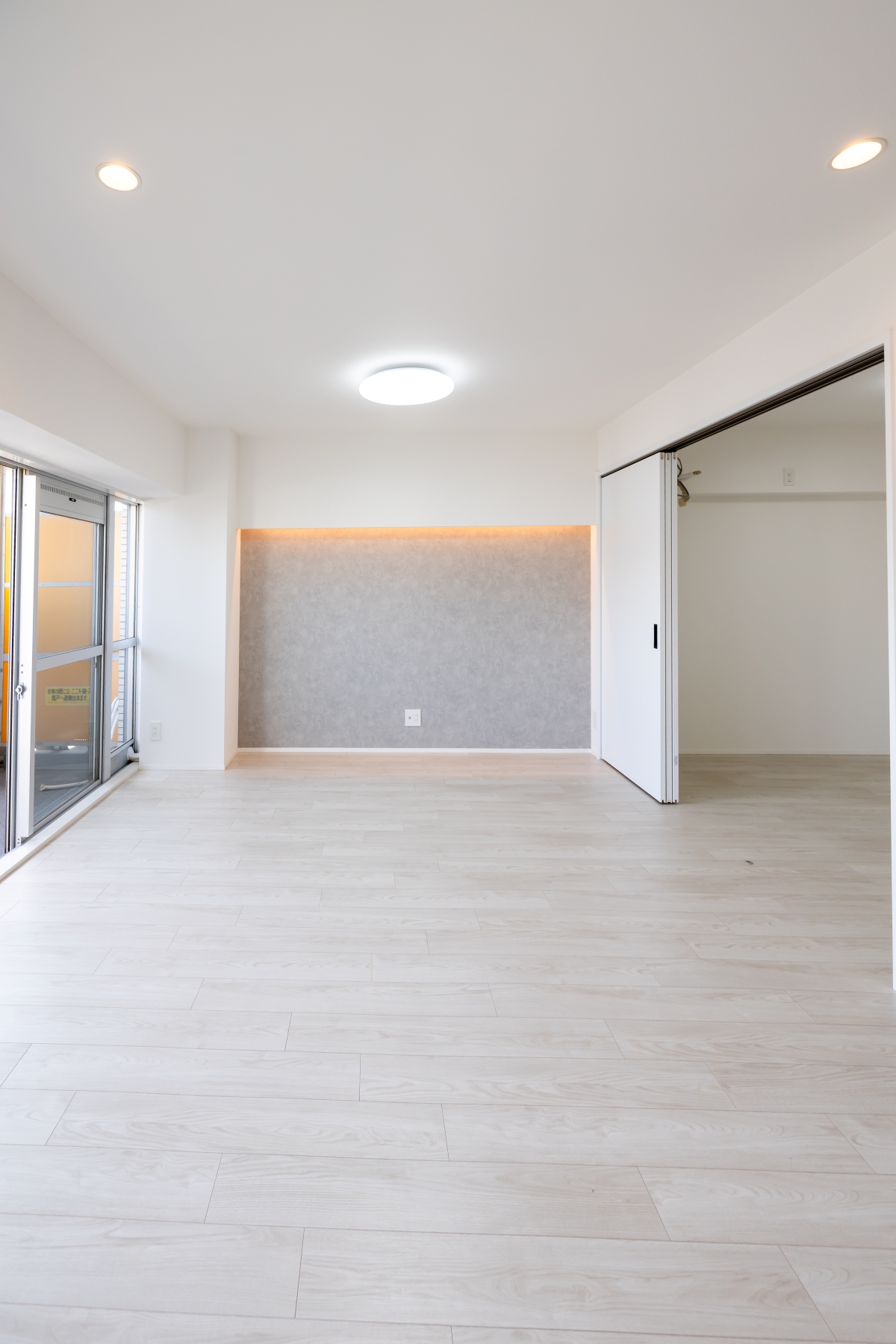 壁面には、落ち着いたグレーのアクセントクロスを採用。間接照明の暖かい光が、空間に奥行きを与え日常を豊かに彩ります。