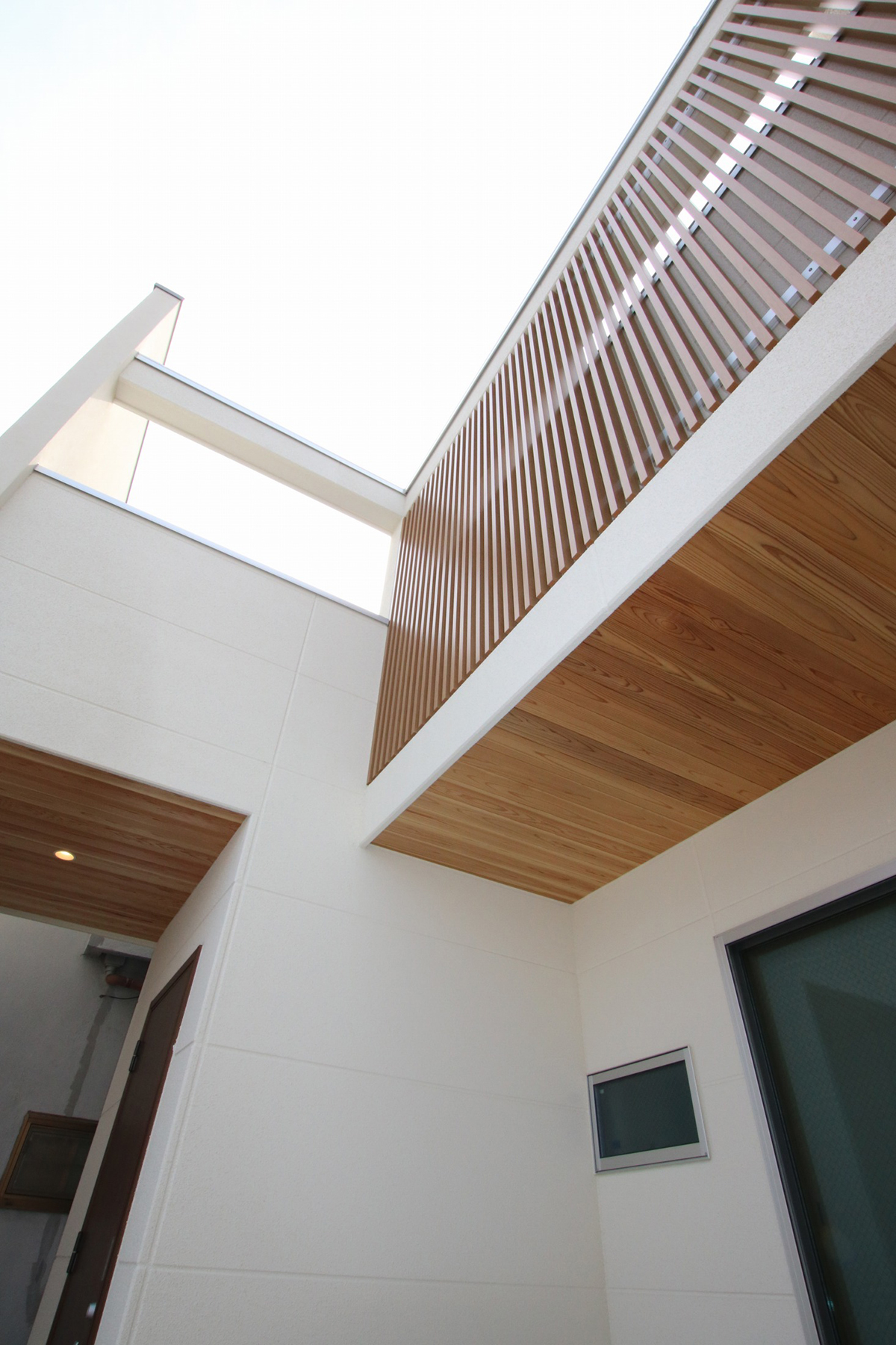 木目調格子が目を惹く外観のこの家は、近づくともっと魅力的な無垢の杉板の軒天井が頭上に広がる。リビングに隣接させた畳コーナーは小上がりにし、造作収納を下部に設けた。おじいちゃんと囲碁をしたり、お昼寝したり、洗濯ものを畳んだり、いつでも家族みんなが過ごせる場所。