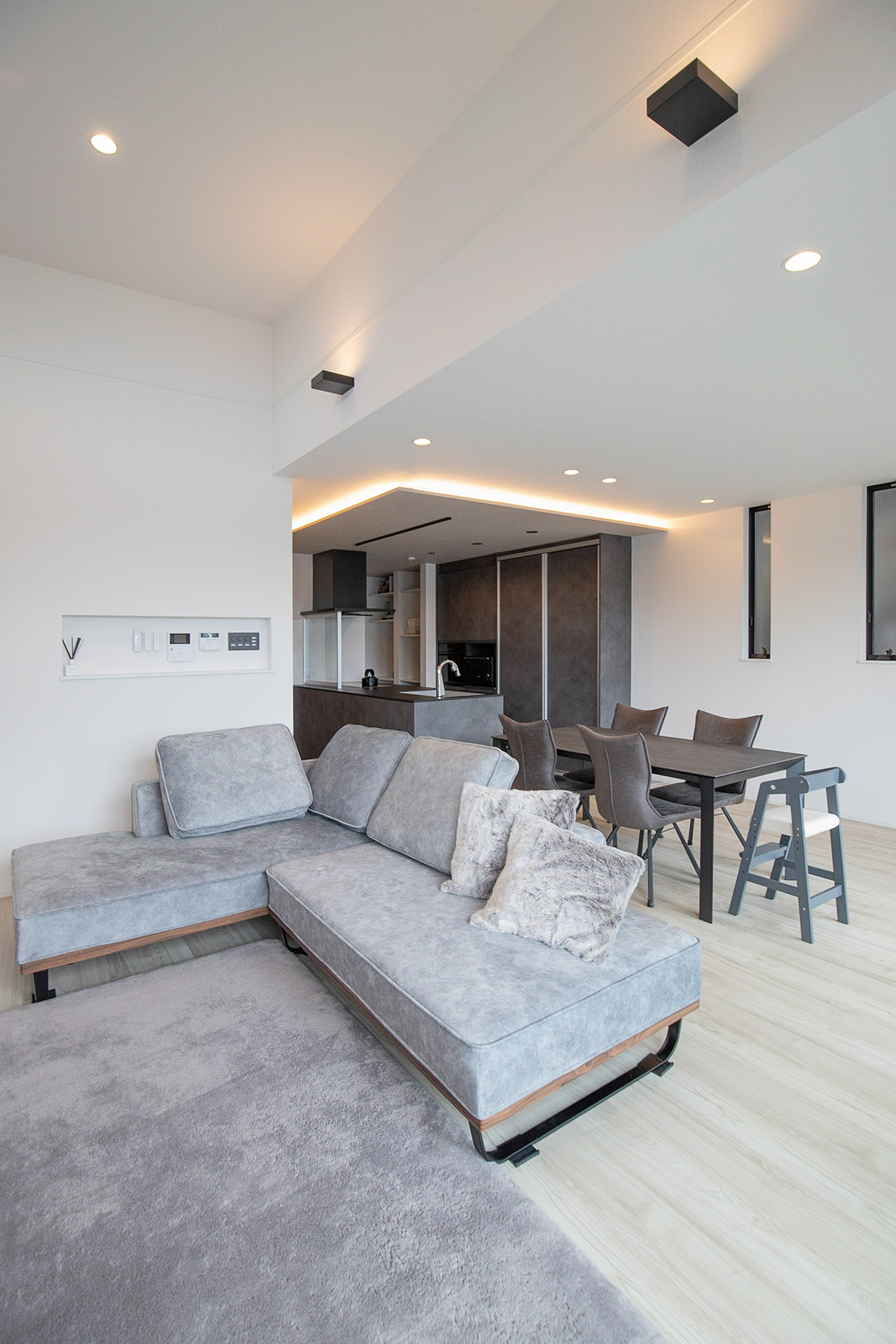 スタイリッシュなインテリアが印象的なLDK。リビングはダイニングの天井より1メートル程高いだけで解放感があります。